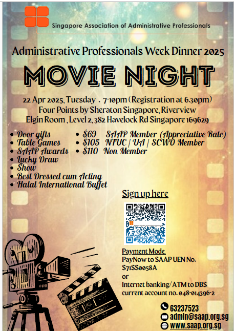We are excited to announce the Administrative Professionals Week (APW) Dinner, hosted by the Organising Committee, on Tuesday, 22 April 2025. This year’s theme is Movie Night, promising an evening filled with appreciation, entertainment, and fun!