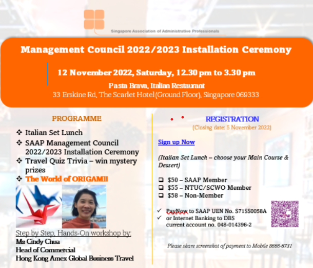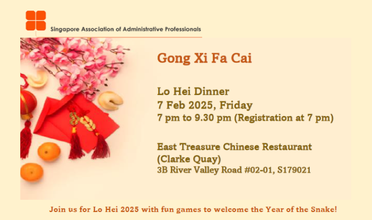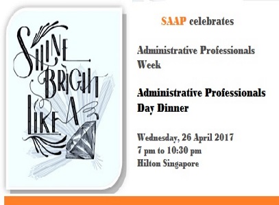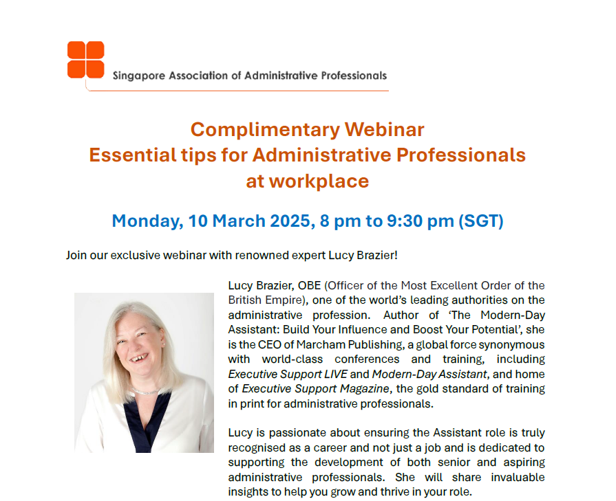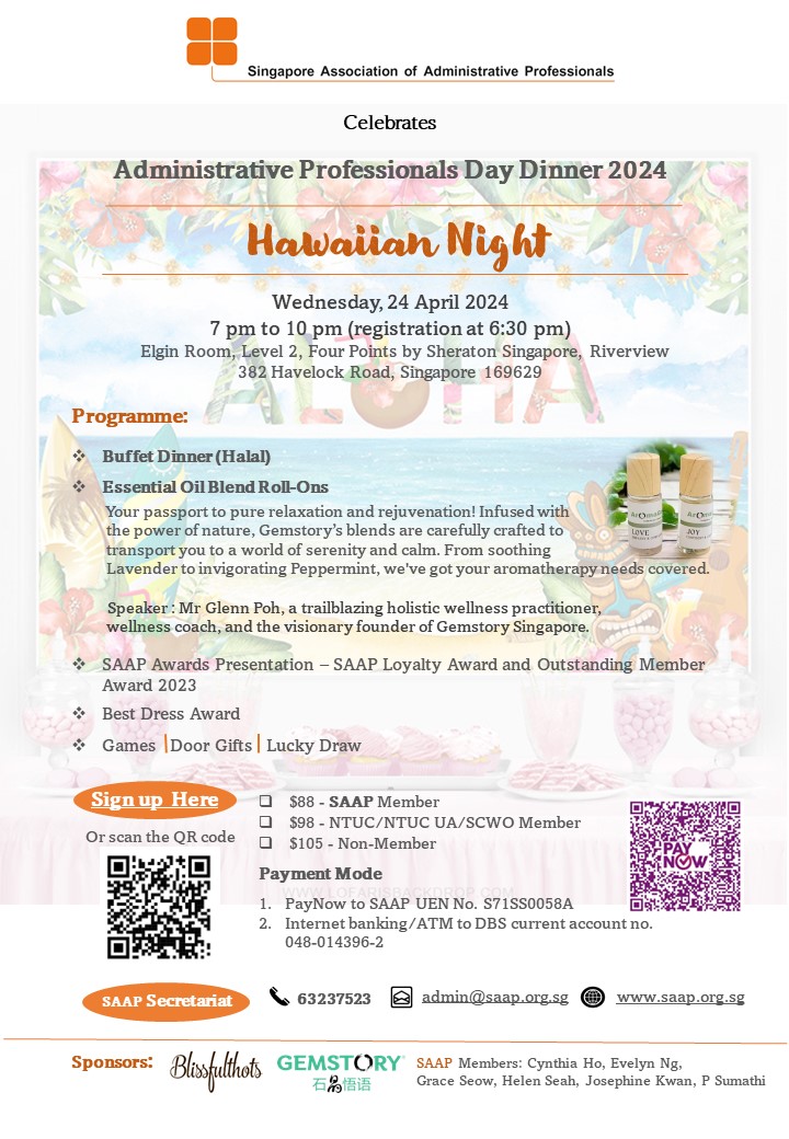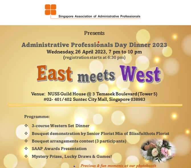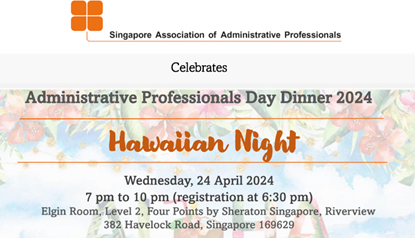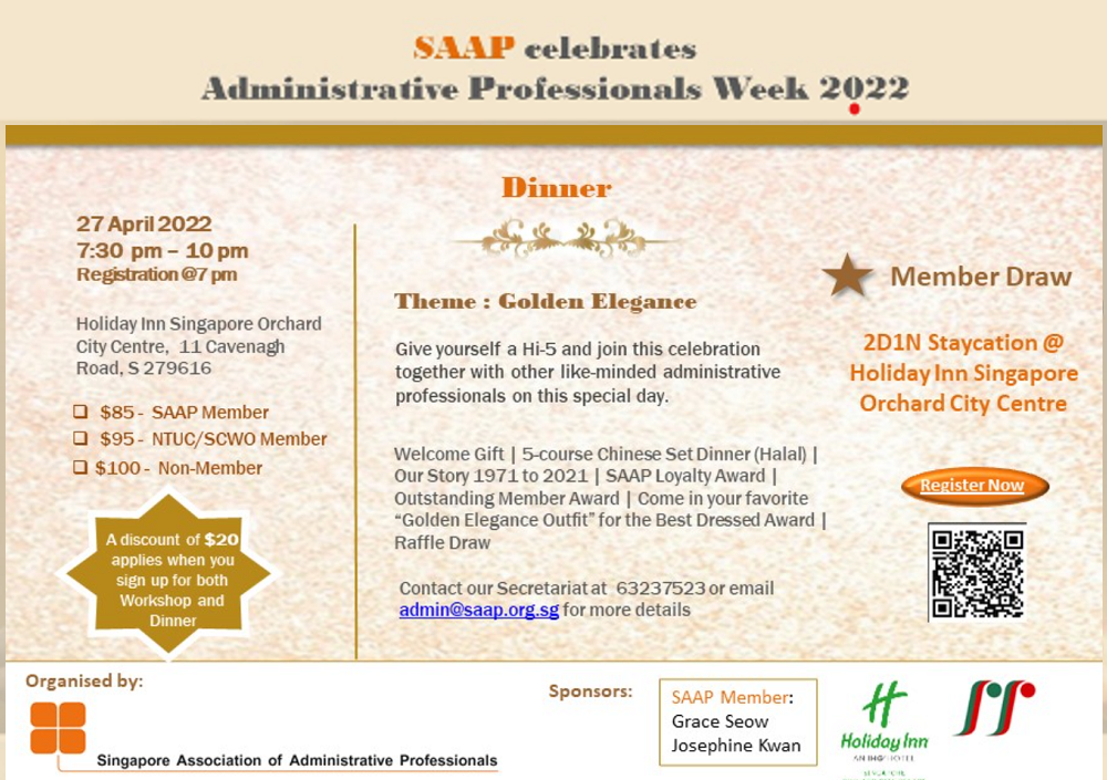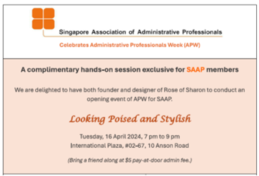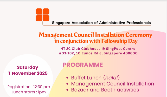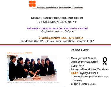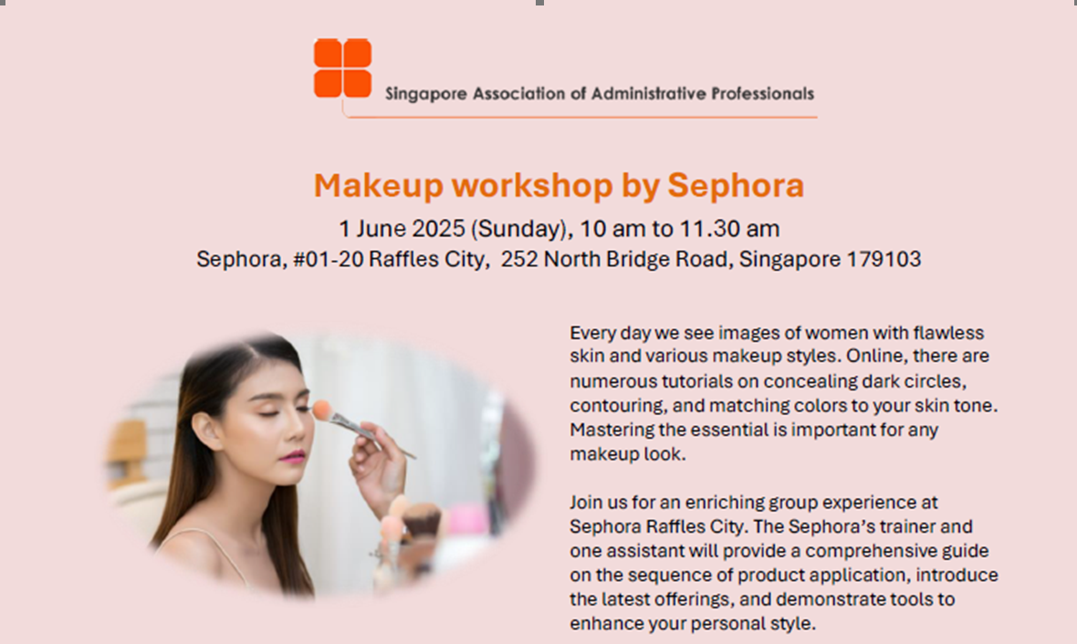 Super User Past Events and Other Activities 2025 Management Council Installation (MCI) Ceremony in conjunction with Fellowship Day/1 Nov 2025 Make-Up Workshop by Sephora – 1 Jun 2025 Musical Box Workshop – 24 May 2025 Administrative Professionals Seminar 2025 - Assistants of Tomorrow: Shaping the Future of Work - 25 Apr 2025 Administrative Professionals Week Dinner – Movie Night / 22 Apr 2025 Complimentary Webinar – Essential tips for Administrative Professionals at workplace – 10 Mar 2025 Lo Hei Dinner – 7 Feb 2025 Chengdu 6D5N Tour – 4 to 9 Jan 2025 2024 Management Council 2024/2025 Installation Ceremony – 23 Nov 2024 How Generative AI is Changing the game for Administrative Professionals (Complimentary Webinar) - 26 Jul 2024 The Unique Gem Bracelet Workshop Wellness Workshop – 28 Jun 2024 Administrative Professionals Day Dinner - Hawaiian Night - 24 Apr 2024 Complimentary Workshop - Looking Poised and Stylish by Rose of Sharon - 16 Apr 2024 Administrative Professionals Day Workshop - Emotional Intelligence at Work, Navigating Relationships for Success – 16 Apr 2024 Lo Hei dinner - 17 February 2024 2023 Explore Singapore City Gallery – 25 November 2023 Management Council 2023/2024 Installation Ceremony – 28 October 2023 Administrative Professionals Day Dinner – 26 Apr 23 Administrative Professionals Week workshop – Impactful Skills and Mindfulness Approach to Success– 18 Apr 23 Lo Hei dinner 2023 - 27 February 2023 2022 Management Council 2022/2023 Installation Ceremony – 12 November 2022 Administrative Professionals Day Dinner – 27 Apr 22 Administrative Professionals Week workshop – Red Wine? White Wine? – 27 Apr 22 Active Ageing – 15 Jan 2022 2021 Children Wishing Well CSR programme – Dec 2021 Honouring the Past, Celebrating the Present, Inspiring the Future via Zoom - 31 July 2021 Discovering the short runway for Data Analytics in Excel - 22 May 2021 Administrative Professionals Week - Introduction to CANVA - 20 April 2021 Lo Hei dinner 2021 - 20 February 2021 Live Webinar - Feet Care - 9 January 2021 2020 Live Webinar - Liver Health and how it affects you - 5 December 2020 An Afternoon Baking Demo via Zoom with Lucy Tan - 7 November 2020 Management Council 2020/2021 Installation Ceremony - 31 October 2020 SAAP/Google Admin Professionals Virtual Workshop - Adapting for Remote Support - 17 July 2020 Webinar - Workplace Mental Health Workshop - 28 & 29 May 2020 Lo Hei dinner - 5 February 2020 2019 Management Council 2019/2020 Installation Ceremony – 02 November 2019 Essential Oil Benefit workshop – 17 August 2019 Batam One Day Tour – 20 July 2019 Administrative Professionals Week Closing Event - Picnic Party – 27 April 2019 Administrative Professionals Day Dinner – 24 April 2019 Administrative Professionals Week Workshop - Sun Tzu’s Art of War for Administrative Professionals – 23 April 2019 Communication Style - At your Best – 21 March 2019 Lo Hei Dinner 2019 – 15 February 2019 2018 Management Council 2018/2019 Installation Ceremony – 10 November 2018 SAAP HUONE Collaboration - Administrative Professionals Series – 12 October 2018 Building your Emotional Quotient (EQ) through Better Communication Skills – 19 July 2018 Personal Assistants/Admin Professionals Master Class – 27 April 2018 Administrative Professionals Day Dinner – 25 April 2018 Lo Hei Dinner – 28 February 2018 2017 Lo Hei 2017 - 8 February 2017 Administrative Professionals Day Dinner – 26 April 2017 Google Office Tour cum "The Office Superhero – Technology to help you fly" workshop - 5 May 2017 Beauty Talk, Care essentials for eyes and skin- 15 July 2017 Management Council 2017/2018 Installation ceremony – 28 October 2017 Talk – Make your impression count, every time – 5 December 2017