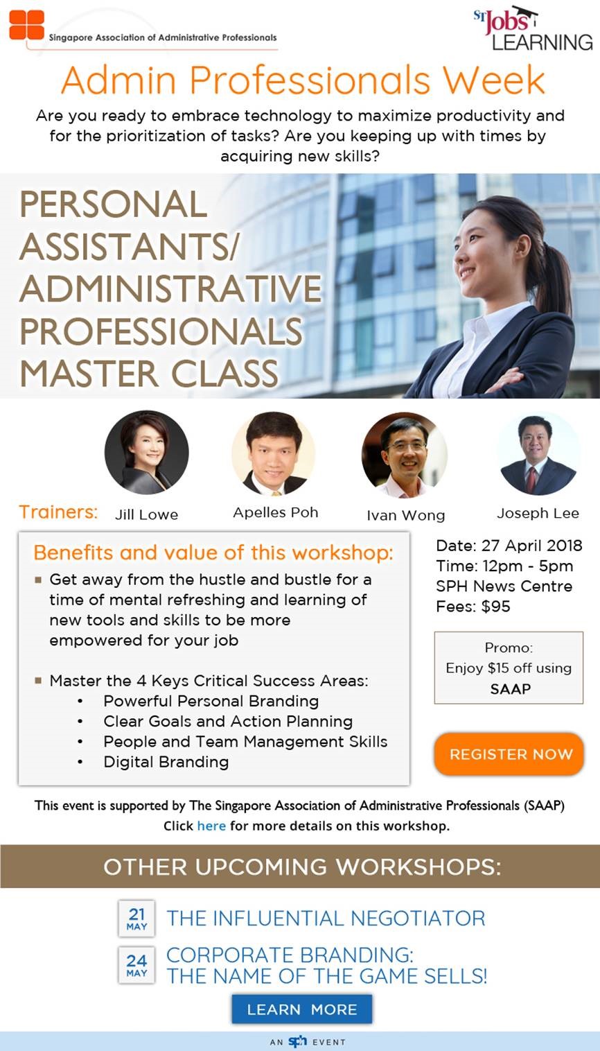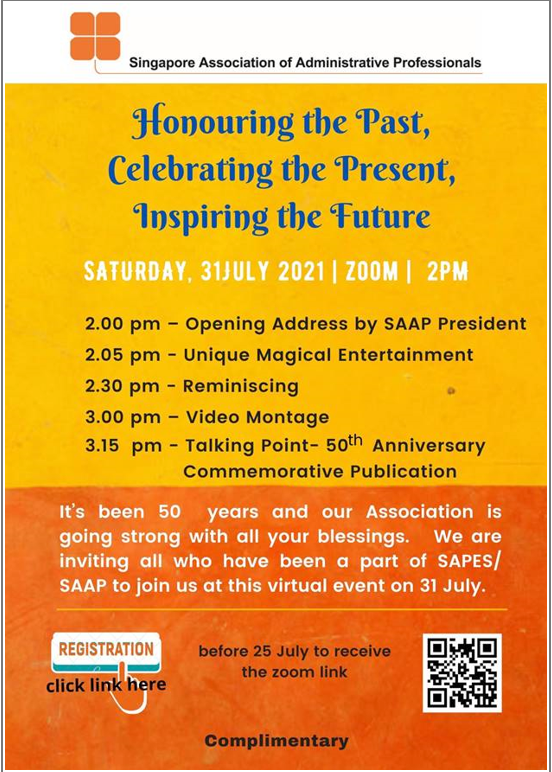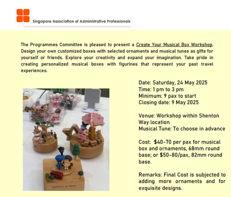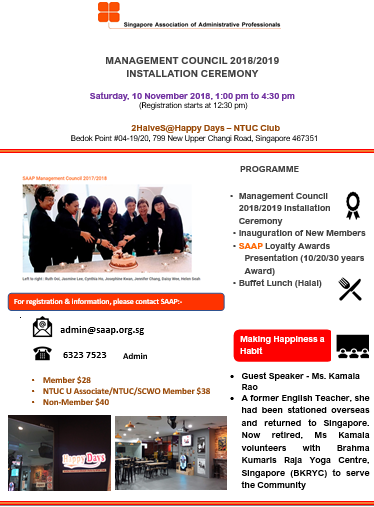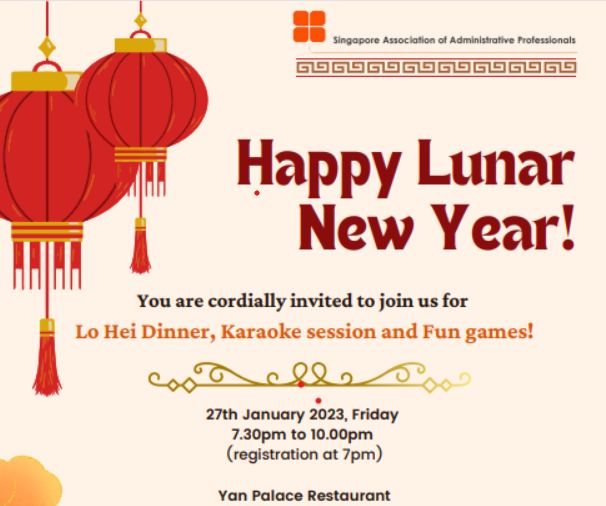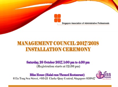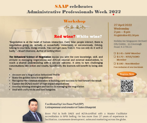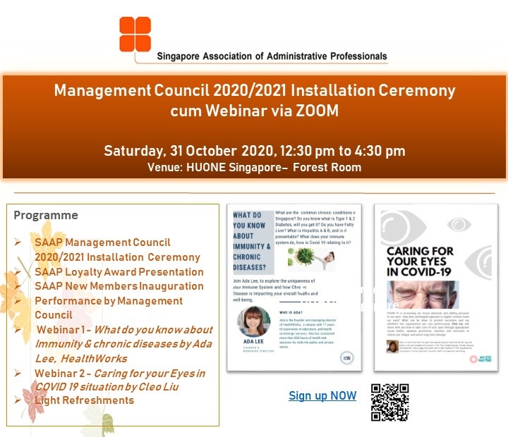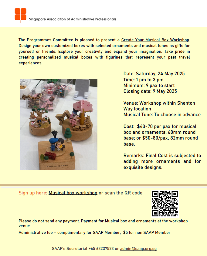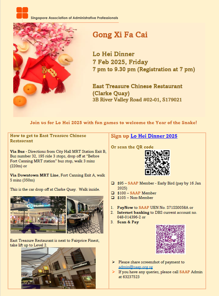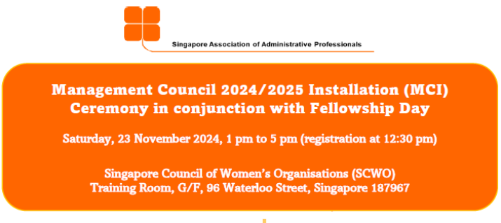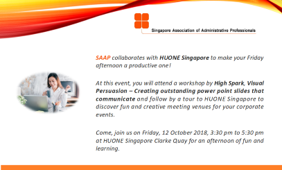 Super User Past Events and Other Activities 2025 Management Council Installation (MCI) Ceremony in conjunction with Fellowship Day/1 Nov 2025 Make-Up Workshop by Sephora – 1 Jun 2025 Musical Box Workshop – 24 May 2025 Administrative Professionals Seminar 2025 - Assistants of Tomorrow: Shaping the Future of Work - 25 Apr 2025 Administrative Professionals Week Dinner – Movie Night / 22 Apr 2025 Complimentary Webinar – Essential tips for Administrative Professionals at workplace – 10 Mar 2025 Lo Hei Dinner – 7 Feb 2025 Chengdu 6D5N Tour – 4 to 9 Jan 2025 2024 Management Council 2024/2025 Installation Ceremony – 23 Nov 2024 How Generative AI is Changing the game for Administrative Professionals (Complimentary Webinar) - 26 Jul 2024 The Unique Gem Bracelet Workshop Wellness Workshop – 28 Jun 2024 Administrative Professionals Day Dinner - Hawaiian Night - 24 Apr 2024 Complimentary Workshop - Looking Poised and Stylish by Rose of Sharon - 16 Apr 2024 Administrative Professionals Day Workshop - Emotional Intelligence at Work, Navigating Relationships for Success – 16 Apr 2024 Lo Hei dinner - 17 February 2024 2023 Explore Singapore City Gallery – 25 November 2023 Management Council 2023/2024 Installation Ceremony – 28 October 2023 Administrative Professionals Day Dinner – 26 Apr 23 Administrative Professionals Week workshop – Impactful Skills and Mindfulness Approach to Success– 18 Apr 23 Lo Hei dinner 2023 - 27 February 2023 2022 Management Council 2022/2023 Installation Ceremony – 12 November 2022 Administrative Professionals Day Dinner – 27 Apr 22 Administrative Professionals Week workshop – Red Wine? White Wine? – 27 Apr 22 Active Ageing – 15 Jan 2022 2021 Children Wishing Well CSR programme – Dec 2021 Honouring the Past, Celebrating the Present, Inspiring the Future via Zoom - 31 July 2021 Discovering the short runway for Data Analytics in Excel - 22 May 2021 Administrative Professionals Week - Introduction to CANVA - 20 April 2021 Lo Hei dinner 2021 - 20 February 2021 Live Webinar - Feet Care - 9 January 2021 2020 Live Webinar - Liver Health and how it affects you - 5 December 2020 An Afternoon Baking Demo via Zoom with Lucy Tan - 7 November 2020 Management Council 2020/2021 Installation Ceremony - 31 October 2020 SAAP/Google Admin Professionals Virtual Workshop - Adapting for Remote Support - 17 July 2020 Webinar - Workplace Mental Health Workshop - 28 & 29 May 2020 Lo Hei dinner - 5 February 2020 2019 Management Council 2019/2020 Installation Ceremony – 02 November 2019 Essential Oil Benefit workshop – 17 August 2019 Batam One Day Tour – 20 July 2019 Administrative Professionals Week Closing Event - Picnic Party – 27 April 2019 Administrative Professionals Day Dinner – 24 April 2019 Administrative Professionals Week Workshop - Sun Tzu’s Art of War for Administrative Professionals – 23 April 2019 Communication Style - At your Best – 21 March 2019 Lo Hei Dinner 2019 – 15 February 2019 2018 Management Council 2018/2019 Installation Ceremony – 10 November 2018 SAAP HUONE Collaboration - Administrative Professionals Series – 12 October 2018 Building your Emotional Quotient (EQ) through Better Communication Skills – 19 July 2018 Personal Assistants/Admin Professionals Master Class – 27 April 2018 Administrative Professionals Day Dinner – 25 April 2018 Lo Hei Dinner – 28 February 2018 2017 Lo Hei 2017 - 8 February 2017 Administrative Professionals Day Dinner – 26 April 2017 Google Office Tour cum "The Office Superhero – Technology to help you fly" workshop - 5 May 2017 Beauty Talk, Care essentials for eyes and skin- 15 July 2017 Management Council 2017/2018 Installation ceremony – 28 October 2017 Talk – Make your impression count, every time – 5 December 2017