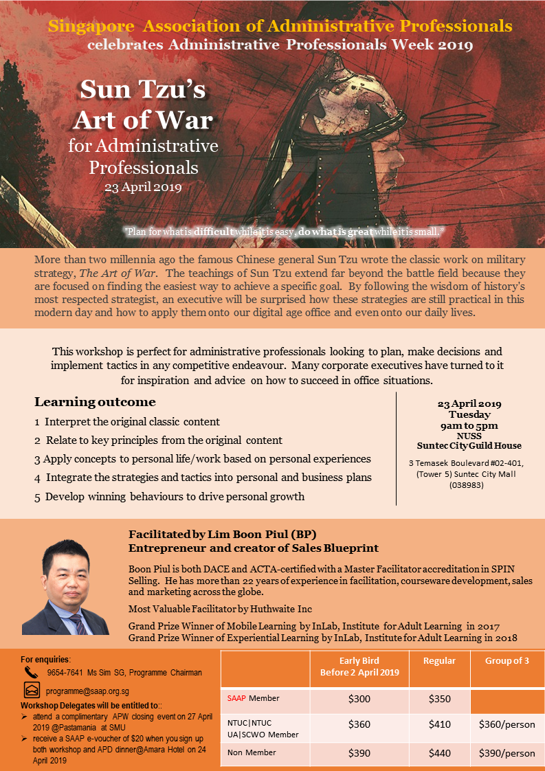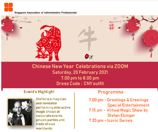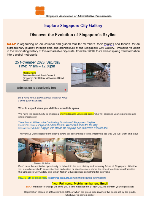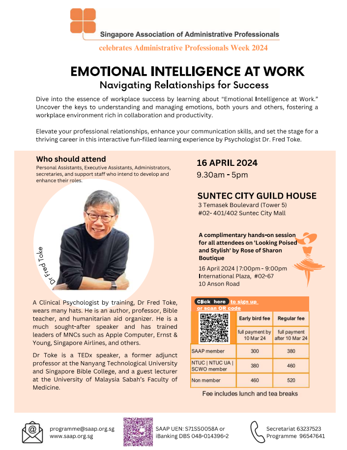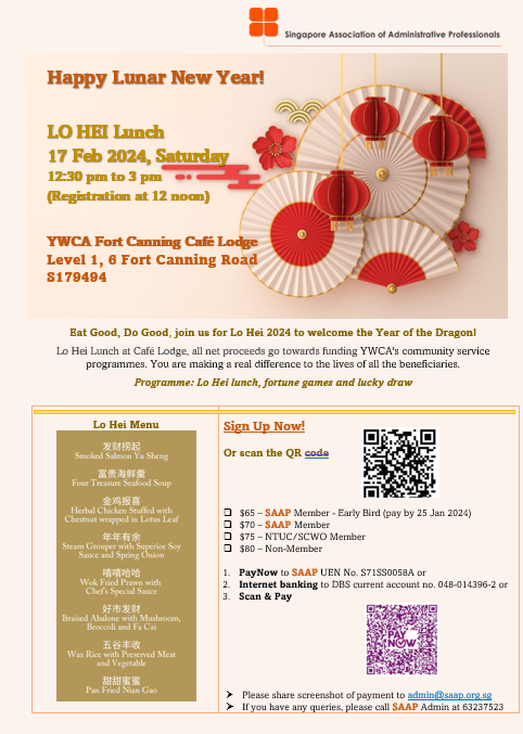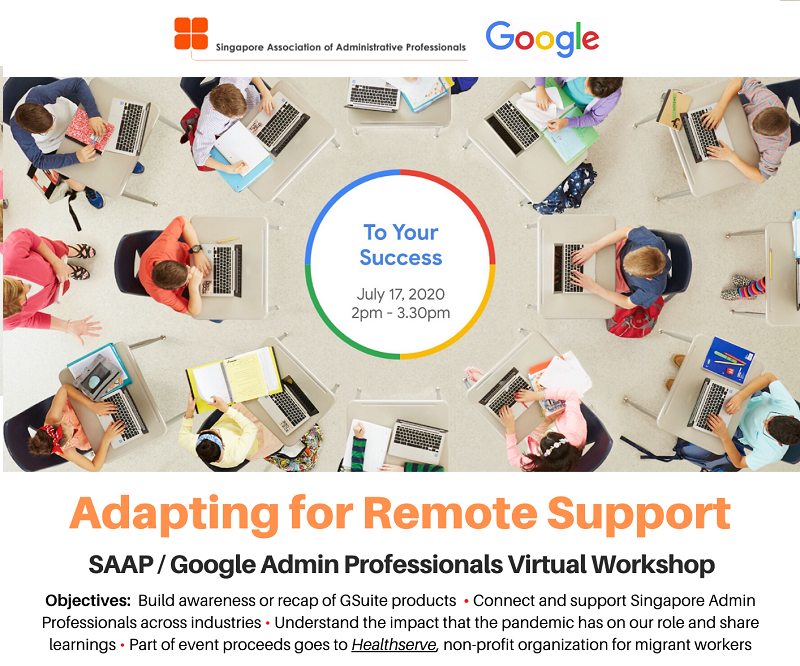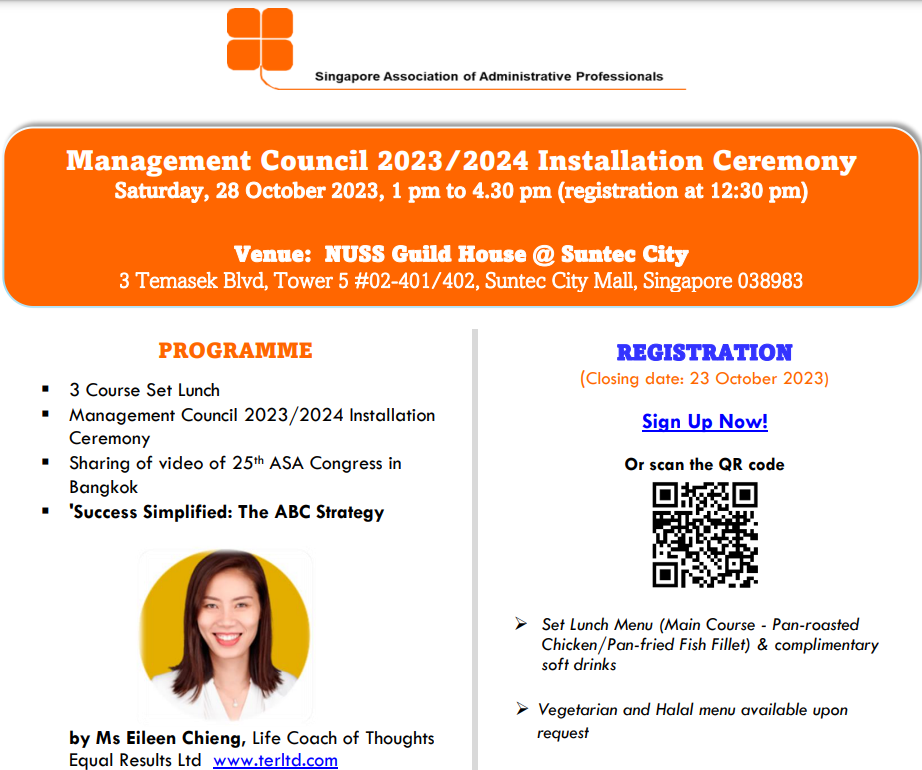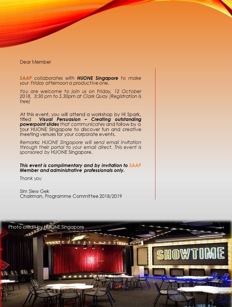 Super User Past Events and Other Activities 2025 Management Council Installation (MCI) Ceremony in conjunction with Fellowship Day/1 Nov 2025 Make-Up Workshop by Sephora – 1 Jun 2025 Musical Box Workshop – 24 May 2025 Administrative Professionals Seminar 2025 - Assistants of Tomorrow: Shaping the Future of Work - 25 Apr 2025 Administrative Professionals Week Dinner – Movie Night / 22 Apr 2025 Complimentary Webinar – Essential tips for Administrative Professionals at workplace – 10 Mar 2025 Lo Hei Dinner – 7 Feb 2025 Chengdu 6D5N Tour – 4 to 9 Jan 2025 2024 Management Council 2024/2025 Installation Ceremony – 23 Nov 2024 How Generative AI is Changing the game for Administrative Professionals (Complimentary Webinar) - 26 Jul 2024 The Unique Gem Bracelet Workshop Wellness Workshop – 28 Jun 2024 Administrative Professionals Day Dinner - Hawaiian Night - 24 Apr 2024 Complimentary Workshop - Looking Poised and Stylish by Rose of Sharon - 16 Apr 2024 Administrative Professionals Day Workshop - Emotional Intelligence at Work, Navigating Relationships for Success – 16 Apr 2024 Lo Hei dinner - 17 February 2024 2023 Explore Singapore City Gallery – 25 November 2023 Management Council 2023/2024 Installation Ceremony – 28 October 2023 Administrative Professionals Day Dinner – 26 Apr 23 Administrative Professionals Week workshop – Impactful Skills and Mindfulness Approach to Success– 18 Apr 23 Lo Hei dinner 2023 - 27 February 2023 2022 Management Council 2022/2023 Installation Ceremony – 12 November 2022 Administrative Professionals Day Dinner – 27 Apr 22 Administrative Professionals Week workshop – Red Wine? White Wine? – 27 Apr 22 Active Ageing – 15 Jan 2022 2021 Children Wishing Well CSR programme – Dec 2021 Honouring the Past, Celebrating the Present, Inspiring the Future via Zoom - 31 July 2021 Discovering the short runway for Data Analytics in Excel - 22 May 2021 Administrative Professionals Week - Introduction to CANVA - 20 April 2021 Lo Hei dinner 2021 - 20 February 2021 Live Webinar - Feet Care - 9 January 2021 2020 Live Webinar - Liver Health and how it affects you - 5 December 2020 An Afternoon Baking Demo via Zoom with Lucy Tan - 7 November 2020 Management Council 2020/2021 Installation Ceremony - 31 October 2020 SAAP/Google Admin Professionals Virtual Workshop - Adapting for Remote Support - 17 July 2020 Webinar - Workplace Mental Health Workshop - 28 & 29 May 2020 Lo Hei dinner - 5 February 2020 2019 Management Council 2019/2020 Installation Ceremony – 02 November 2019 Essential Oil Benefit workshop – 17 August 2019 Batam One Day Tour – 20 July 2019 Administrative Professionals Week Closing Event - Picnic Party – 27 April 2019 Administrative Professionals Day Dinner – 24 April 2019 Administrative Professionals Week Workshop - Sun Tzu’s Art of War for Administrative Professionals – 23 April 2019 Communication Style - At your Best – 21 March 2019 Lo Hei Dinner 2019 – 15 February 2019 2018 Management Council 2018/2019 Installation Ceremony – 10 November 2018 SAAP HUONE Collaboration - Administrative Professionals Series – 12 October 2018 Building your Emotional Quotient (EQ) through Better Communication Skills – 19 July 2018 Personal Assistants/Admin Professionals Master Class – 27 April 2018 Administrative Professionals Day Dinner – 25 April 2018 Lo Hei Dinner – 28 February 2018 2017 Lo Hei 2017 - 8 February 2017 Administrative Professionals Day Dinner – 26 April 2017 Google Office Tour cum "The Office Superhero – Technology to help you fly" workshop - 5 May 2017 Beauty Talk, Care essentials for eyes and skin- 15 July 2017 Management Council 2017/2018 Installation ceremony – 28 October 2017 Talk – Make your impression count, every time – 5 December 2017